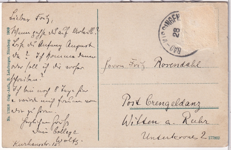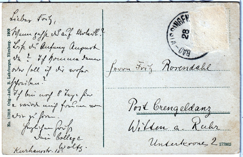 - an Herr Fritz Rosendahl, Post Crengendanz in Witten a. Ruhr, Unterkrone 2;