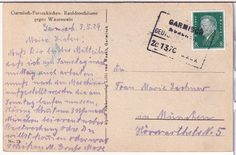 - gelaufen per Bahnpost ab Garmisch am 3.5.1929;