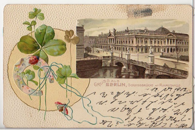 ALTE ANSICHTSKARTE - PRÄGEDRUCK - GRUSS AUS BERLIN - SCHLOSSBRÜCKE MIT RUHMESHALLE um 1900, ALBER KUNKEL